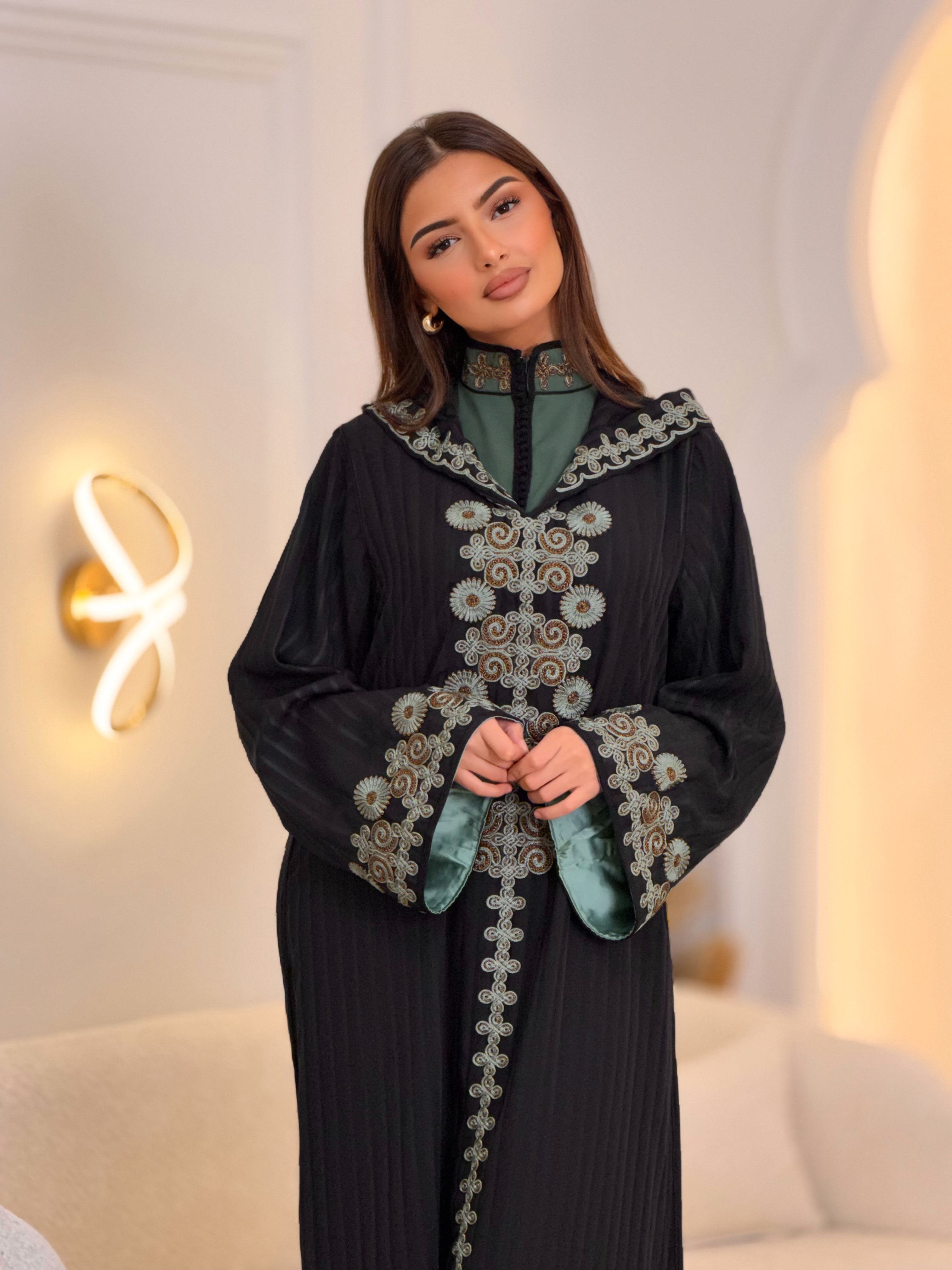 Cada caftán viene acompañado de su cinturón a juego y se presenta en una funda protectora personalizada para mantenerlo en perfectas condiciones.