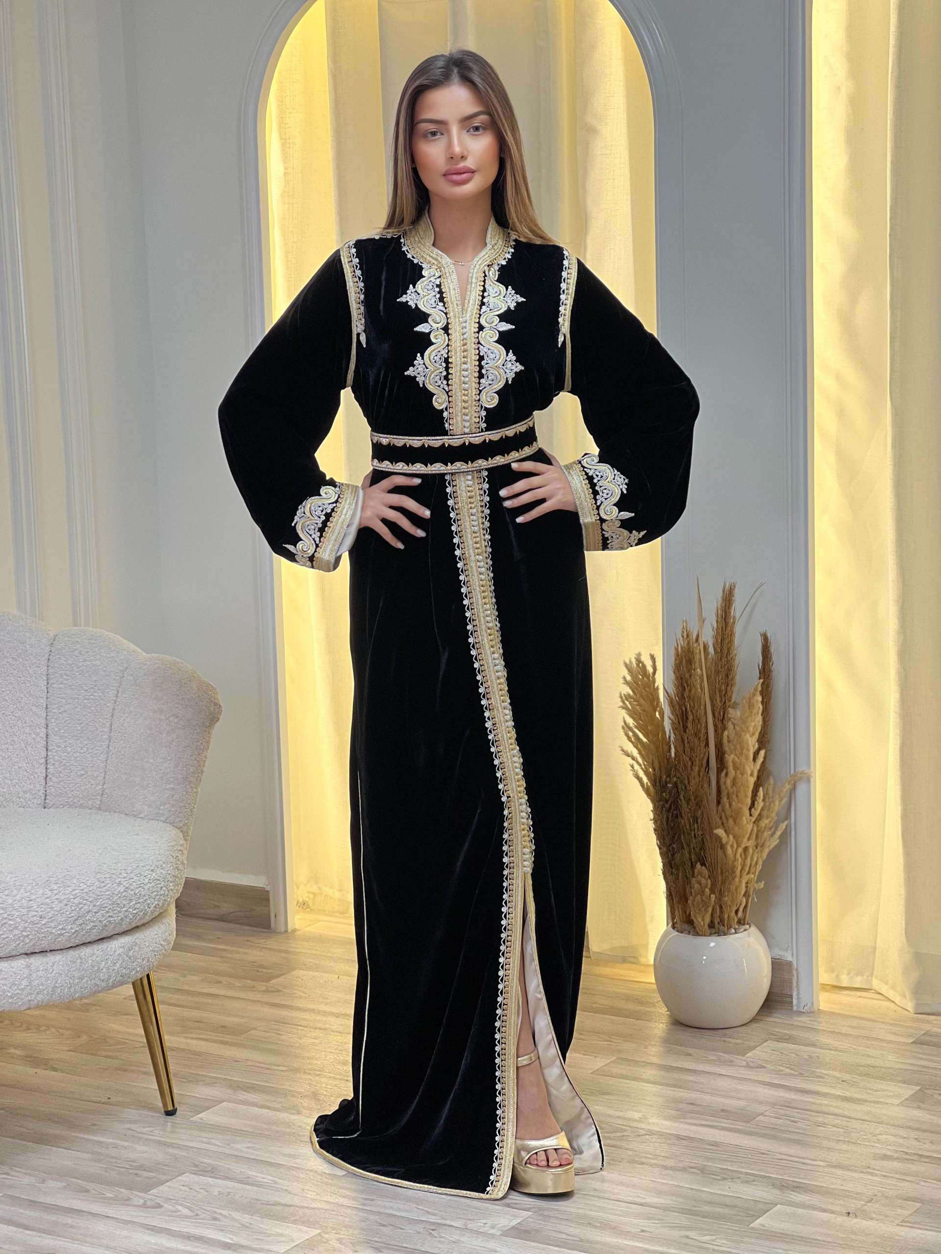 Embellissements : Broderies dorées et argentées sur le col, les manches et les ourlets, mettant en valeur l'artisanat traditionnel.Ceinture : Livré avec une ceinture assortie incluse avec le Kaftan.