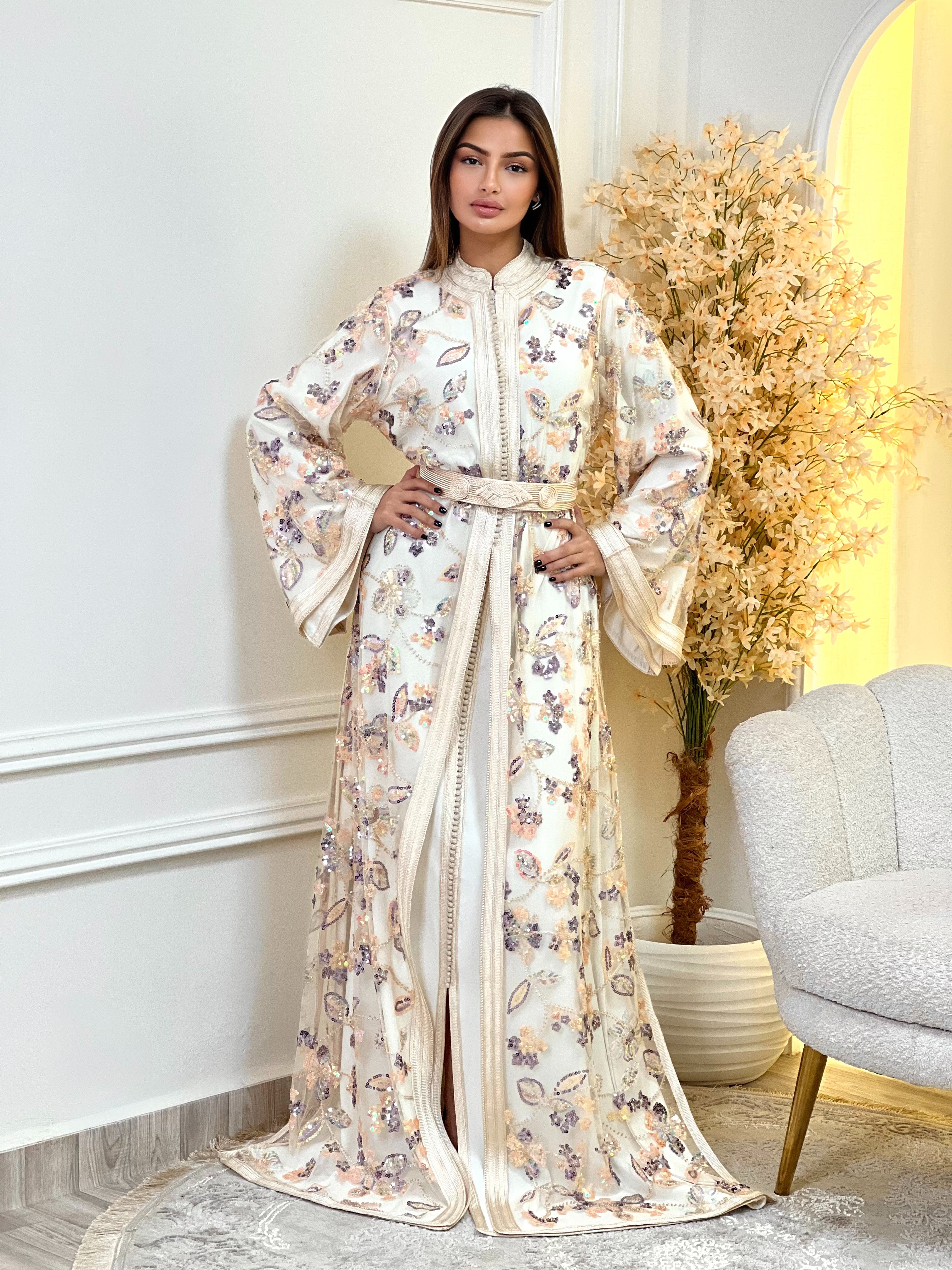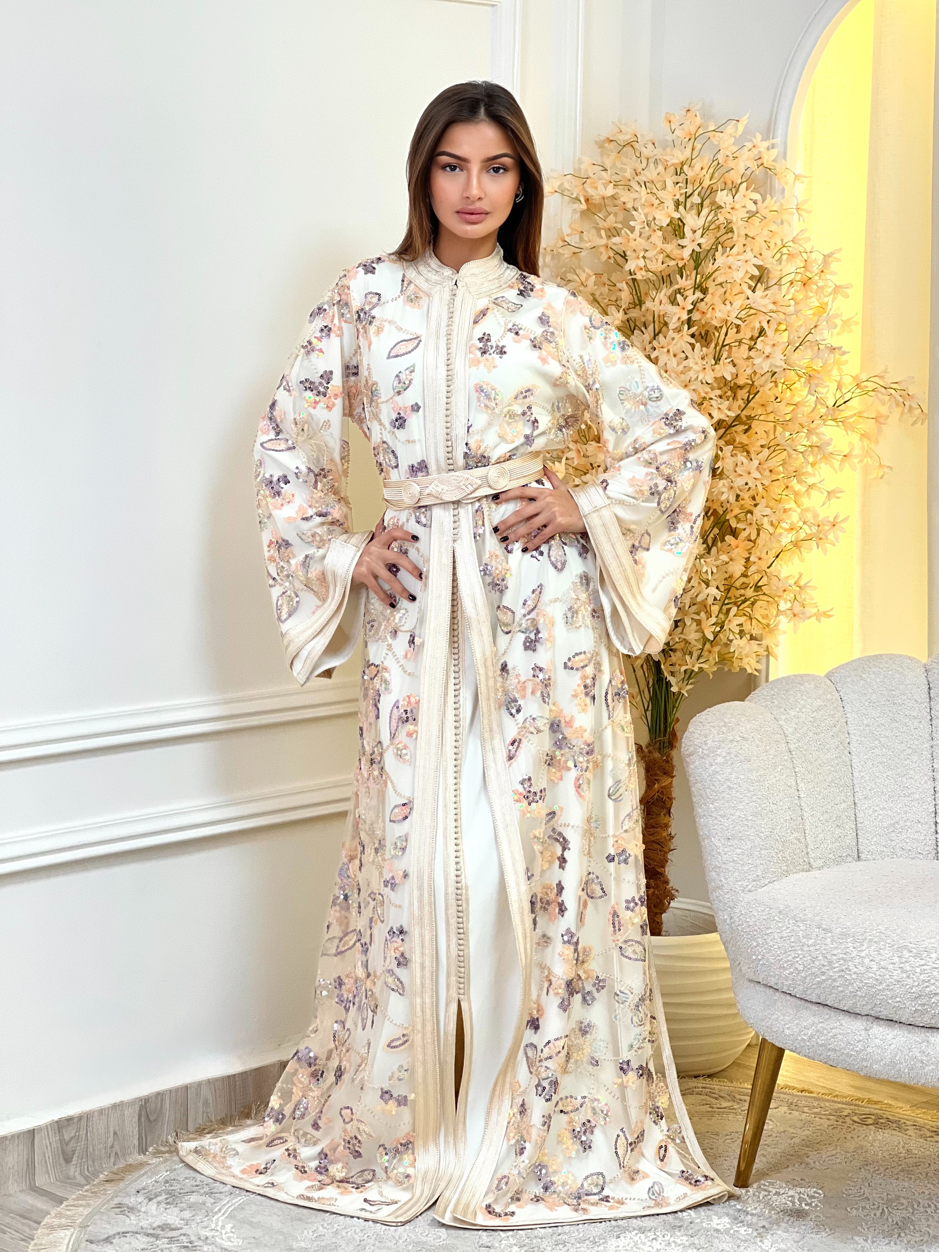 Chaque caftan est accompagné de sa ceinture assortie et présenté dans une housse de protection sur mesure afin de le conserver en parfait état.