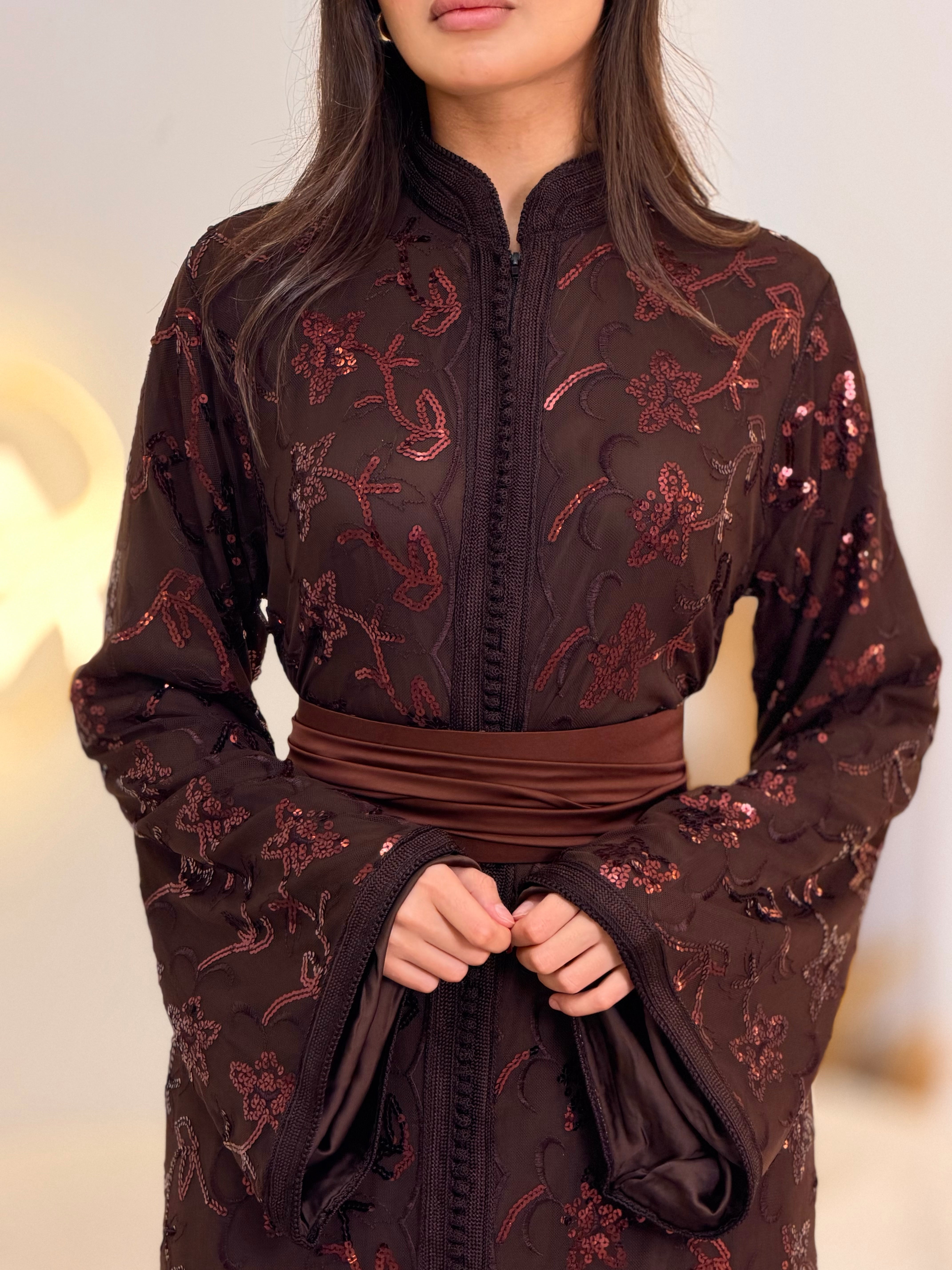 Chaque caftan est accompagné de sa ceinture assortie et présenté dans une housse de protection sur mesure afin de le conserver en parfait état.